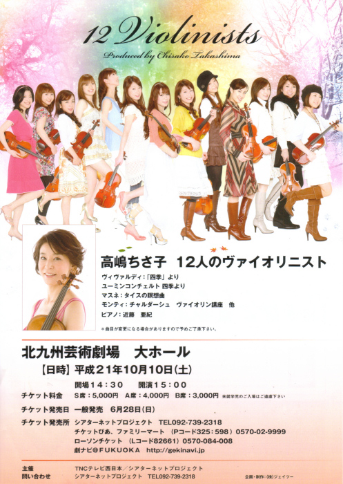 さて昼過ぎからは、今度は北九州芸術劇場に行き、「高嶋ちさ子 12人のヴァイオリニスト」を鑑賞。実は以前からバイオリンには興味があって(「エルカザド」のOP曲「光の行方」のバイオリンのパートなんか好きだし)、一度バイオリンのライブを観たいと思っていた。今回、ちょうど良い機会だったので、鑑賞することにした。決して、12人の可愛い娘が目当てではない。いや、少しはあるけど(爆)。個人的には、緊張感のない娘が良いかと(笑)。…にしても彼女ら、凄すぎ!。バイオリン演奏の超絶テクニックには驚いた。だからライブ鑑賞は止められないんだ。後、このユニットのMCは面白すぎる。当然、彼女らはバイオリニストであって、コメディアンじゃない。なのに、そこいらのコメディアンより遥かに面白い。何回大爆笑したか。もっとも一番大爆笑したのは、飛び入りで参加した素人の指揮者ぶりだったけど(笑)。しかし今回、セットリストを書いた印刷物が配布されなかったのが寂しかったな(響ホールでは、よく配布されるのに)。一応、覚えている範囲書いておくが、クラッシックってそれほど明るくないので>私、間違っている部分が多いかも。あまり当てにしないで読んで欲しい(笑)。演奏順もかなり怪しい(苦笑)。