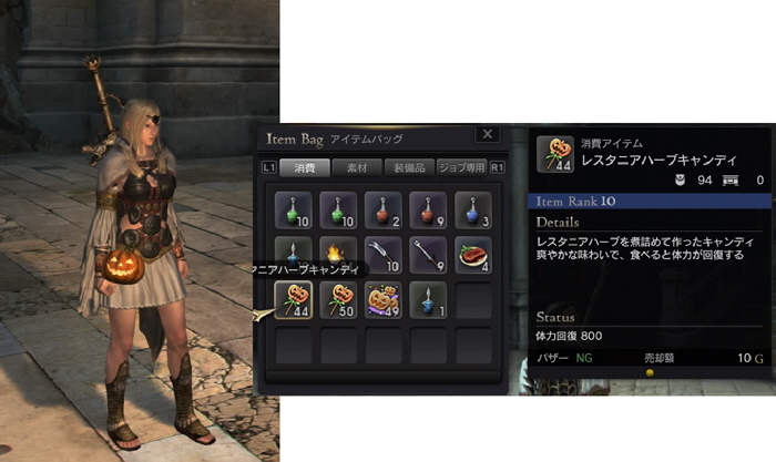 ハロウィン中にお菓子を集めるイベント。敵からだけでなく、宝箱や採取からもドロップできる。ちょっと周っただけで、これだけ集まった(写真)。