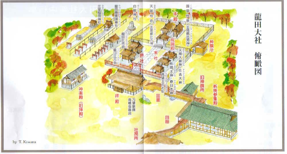 そして、最後は今回の目的にひとつである龍田神社。JR法隆寺駅から大阪方面へ二駅ほど行ったところにある三郷駅。駅から降りて、5分ほど歩いたところにその神社はある。当然、観光客なんて一人もおらず、地元の人間らしき人が1~2人いるくらい。さっそく、境内を探索するが、龍田姫の存在が確認できない(名称は「龍田」だけど)。境内には白蛇を祀っているとか、お稲荷さんを祀っているとか書かれているが、どうもはっきりしない。仕方なく帰ろうとしたら、巫女さんがお守りを売っていたので、その巫女さんに聞いてみた。するとカタログまでとりだして、丁寧に教えてくれた(感謝)。結論を言えば、やはりここで間違いはなかった。場所は拝殿の奥の5つある建物の左側の奥。下の写真で龍田比売命と書いてあるところ。ここに鎮座しているらしい。おおっ、ついに居場所を突き止めたぞ。あと、御守りにも他では見かけない「風神」という文字が書いてあった。これは間違いないね。