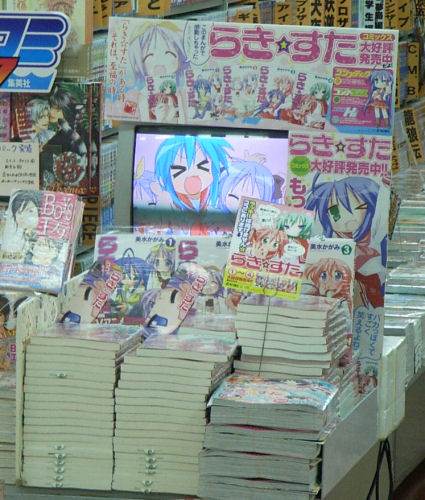 ↓は某本屋の写真。オタク系のショップでなく、普通の本屋がこれだもの、「らき☆すた」の人気は凄いよね。