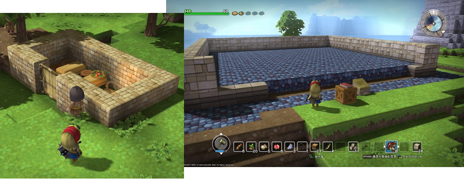 ・建設予定地には、西洋風の城を建設する予定。とりあえず、基礎と敷石をひいてみた。あと、壁を少しだけ置いてみる(写真右)。