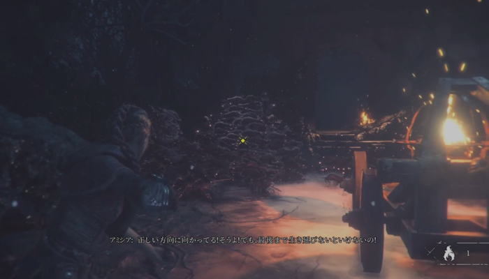 ・「第11章:生存」と「第12章:残されたもの」をクリア。第11章は会話だけで終了するので簡単だが、第12章がとにかく難しい。これまでと違い、ネズミが竜巻みたいになって襲ってくるところは圧巻。恐怖さえ覚える。特に明かりのついた荷車を押していくところが大変。まだ出てくるのとかぁ…ってくらい台風ネズミが襲ってくる。このシーンが一番死んだな。(写真)