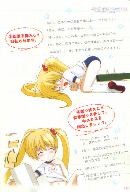 一応、文房具と言うことで取説が付いているんだが、それがフィギュア以上にぶっ飛んでる。「きゅ、急に、入れるなッ!」とか、「無理っ、駄目っ…、そんなモノ、入れちゃ…、ボク、壊れちゃうよぉ」とか、「はあっ。はあっ…、この振動が、振動がァ…」と言った感じで延々と数ページにわたって解説してる。しかも最後のページには、「【CAST】、こもり:能登麻美子、はるみ:榊原ゆい、くるみ:植田佳奈、かすみ:生天田仁美」と言う文章が。これ何?。もう何がなんだか(笑)。