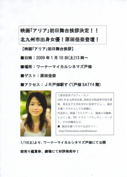 「アリア」を観に行ってきたが、なんと原田佳奈さんによる舞台挨拶があった。映画の開始前に振袖姿で登場。実は映画は6年前に完成していたもので、当然原田佳奈さんの顔も変わっている。今は映画の顔より、ずっと大人っぽくなって、良い感じになっていた。舞台挨拶では、どうやら北九州の人らしく、地元の話などが出ていた。その他では、映画撮影の話や今までの経歴やら。今まで知らなかった女優さんだが、なかなか気さくな人のようで、ちょっとファンになってしまいそうだ。ただ無理に方言で喋ることはなかったと思うけど(笑)。彼女のブログ(↓)でも、舞台挨拶のことが書かれている。また、写真も出ているので必見だ。