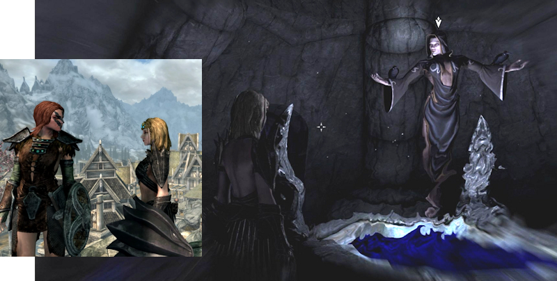 ・しかし、盗賊ギルドが信仰するデイドラのノクターナル(写真右)、相変わらずエロいなぁ。あと、マイキャラが他の登場人物と比べて、異様に背が低いんだよなぁ(写真左)。キャラクリのとき、身長の項目はなかったのに。種族がブレトンだからかな?。