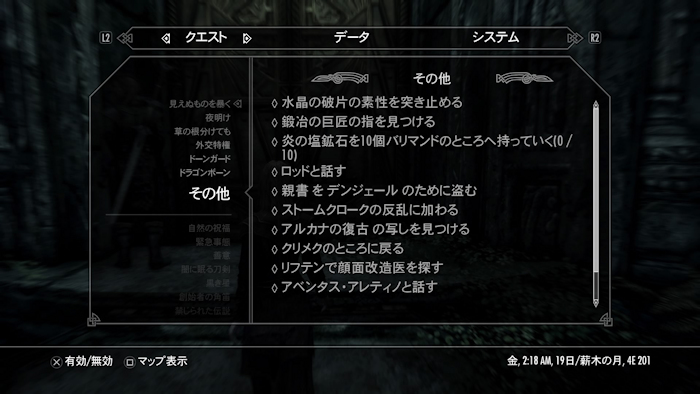 ・「見えないものを暴く」の続き。前回、あとちょっとだった。引き続き、ウィンターホールド大学クエスト「マグナスの目」まで一気にクリア。つまり、ウィンターホールド大学クエストをすべてクリアした。しかし、「マグナスの杖」のときに入るラビリンシアンのダンジョンは大変だった。中にスケルトンドラゴンやウィスプマザーやモロケイなどの強敵がいっぱいいる、すっかり忘れていたよ。さすがにスケルトンドラゴンは現在のレベルでは絶対に勝てないので、やり過ごしたけど。