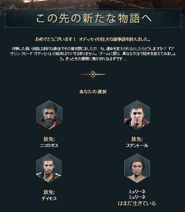 ・メインクエスト「我らは立ち上がる」から「スパルタでの食事」までクリア。ついでに後日談の「忘れない」もクリア。…って事で、メインクエストをすべてクリア。どうやら、良いほうに選択肢を選択したようで、弟生存のグッドエンディングに辿り着いた(写真上)。さて、まだクリアしてないクエストはいっぱいあるし、行ってない地もいっぱいある。ここからが本番だ。これがオープンワールドもの、特に洋ゲーの良いところだな。