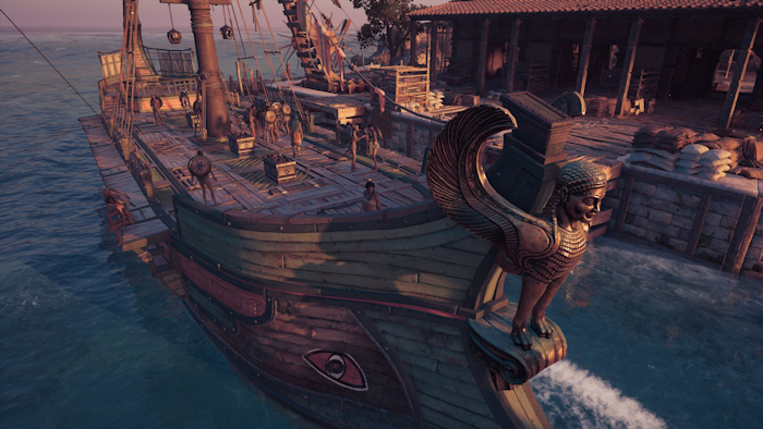 ・写真の下は現在の船の様子。今まで船首像がなかったが、スフィンクスのクエストで、スフィンクスの船首像を手に入れたので付けた。あと、分かりづらいが船員がすべて女性になった。これはオリンピックのクエストの報酬。船員が歌う船歌が女性の声になるのが良い。