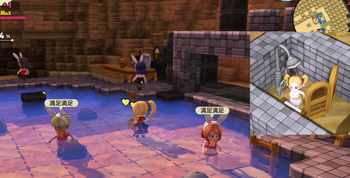 ・一方、レベルが上がるとぴちぴちガールがやってきて、町が華やかになる。写真は彼女らがプールで泳いでいるところ。ついでに、主人公のシャワーシーンも公開。