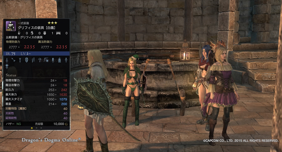 ・今日雇った二名のポーン(写真右)。右の紫の衣装は水樹奈々ボイスのソーサラー、中央の緑のビキニアーマーは坂本真綾ボイスのファイター。残念ながら、二人ともあまり好みでなかった(笑)。まぁ、戦闘ではむちゃくちゃ助かっているけど。