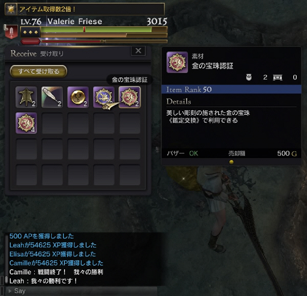 ドラゴン系を二匹倒して、「銀の宝珠認証」が四つ、「金の宝珠認証」が二つ。どうも、少しでもレベルが高いドラゴンのほうが数多く出るみたいだな。しかし、こりゃ、必要数を集めるのが大変だ。一方、「宝珠認証【レウス】」と「宝珠認証【レイア】」は、今日ちょっと周っただけで、71と75。こちらは出過ぎだよ。