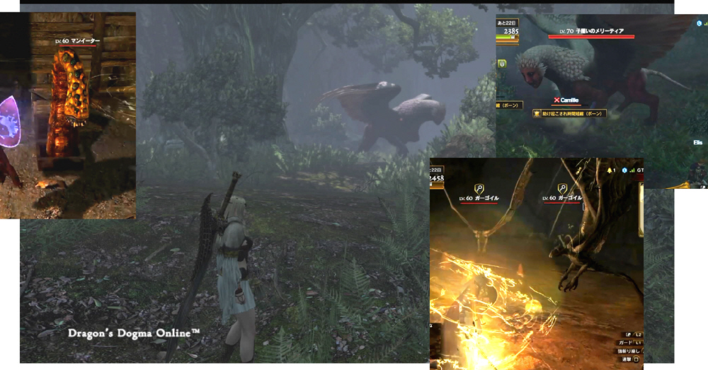 ・モンスターと言えば、マンイーターなるモンスターと遭遇(写真左)。普通は宝箱に擬態している奴で、一般で言うミミックと言う奴だな。こいつは結構新鮮だった。後、ポーンのクラフト試験の素材探しでミスリウ森林に行ったときに、スフィンクスの高レベルのようなモンスターと遭遇(写真中央と右上)。あっと言う間に、パーティが全滅したよ。しかし、なんでレベル70のモンスターがでミスリウ森林にいるんだ。