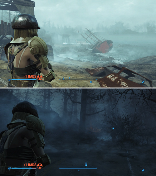 上記のクエストをクリアすると、ドドッと新しいクエストが増え、どれから手を付けたらイイんじゃい状態になる。とりあえず、メインクエストを進めることにする。酒場にいる老人に道案内を頼み、アカディアへ向かう事になる。途中、怪物に襲われたり、チャイルド・オブ・アトムの宣教師と出会ったりして、波乱万丈。…で、町に着くとクエストクリア。以降、この老人が仲間に出来るし、彼の小屋が拠点にもなる。しかし、ファー・ハーバーの時も思っていたけど、この島って、先に進むほど霧が濃厚になるね。そのため、動きがカクカクしてしまう。こりゃ、気になる人は気になるだろうね。私はそれほど気にならなかったし、雰囲気を重視したいので、このままプレイして行くけどね(クレームが多いので、霧なしverを近く配信するらしい)。