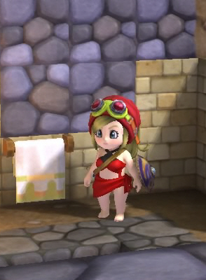 ・写真は「からくりパーツ」を探しに行ったときに偶然に見つけた「あぶないみずぎ」。橋の上で大砲を撃ちまくったので、橋に穴が開き、その為に筋肉三人組が下に落ちた。そのとき、偶然に見つけた。しかし、全然危なくないじゃん(笑)。