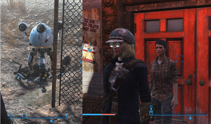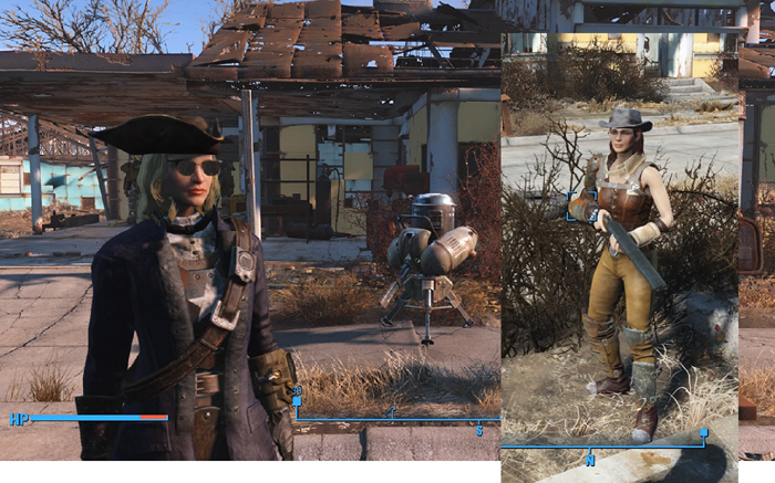 ・写真の左は現在のマイキャラ。装備は、「Old Guns」の報酬であるミニッツメンの将軍の制服。なんか、どこぞの海賊の船長みたいだな(笑)。右はケイトの姿。まるで西部劇の衣装だ。