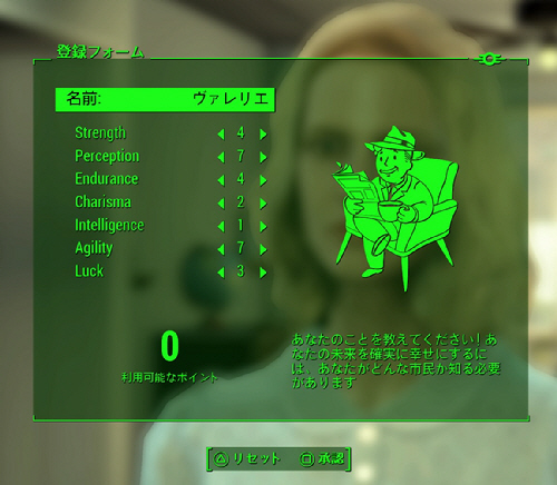 ・ステータスはいつも極振りをするのだが、このゲームに関しては極振りしない方が良いと言う情報を聞いていたので、ある程度均等に降った。銃中心で戦う予定なので、PerceptionとAgilityを中心に降る。Intelligenceは前作のときもハッキングとかやらなかったので、これだけ降らないでいた。あと、残りのポイントを均等分けした感じかな。ただ、持ち運び重量の関係で、Strengthだけ少し多めにした。結果が↓。まぁ、あまり神経質にならないでも、後々何とかなるだろう。