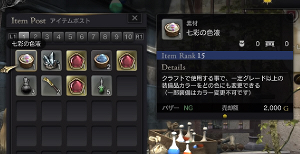 ・ガチャ回したら、「七彩の色液」なるものが出てきた。「装備品カラーをどの色にも変更できる」らしい。最初、B賞なのでガッカリしたが、これ、もしかしたら当たりかな?。
