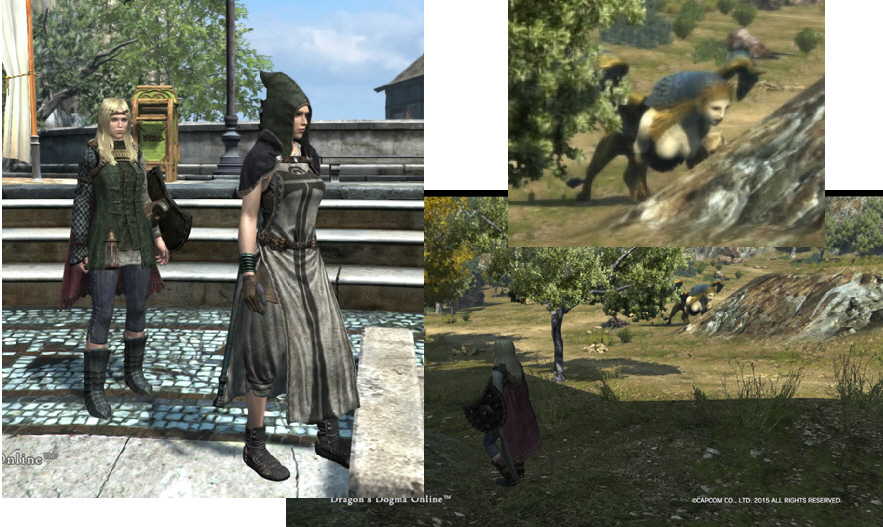 ・クエストの途中で、写真右のモンスターと遭遇。顔が人間の女性、胴が四足の獣、そして翼がある。外見から判断して、スフィンクスかな?。強そうだったので、ダッシュで逃げたけどね。