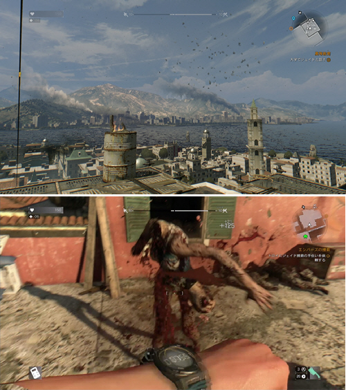 ・写真の説明。上の写真は旧市街の絶景ポイント、下の写真はゾンビの首切断シーン。静止画だと、何が起こっているのかよく分かりませんね(笑)。