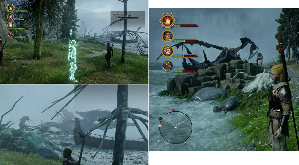・ところで、この地でドラゴンと巨人が戦っている場面に遭遇した。現在のレベルでは、この二体にとても太刀打ちできないので、側をそっと通り抜けたけどね(笑)。ちなみに、そのときの写真が左上。これじゃ分かりづらいので、ドラゴンと巨人をアップにしたのが左下。更にぐるっと回り込んで逆の場所から撮影したのが右の写真。写真じゃ分からないと思うが、実際に遭遇したら、むちゃくちゃ迫力があるよ。