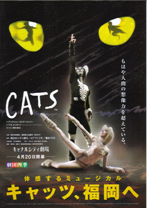 劇団四季の「キャッツ」を観てきた。本当はGWに観に行きたかったのだが、チケットが取れなくて。やっぱ、人気があるんだ。もう、超有名な作品なので今更内容を紹介しないが、実際に生まで観ると迫力があるなぁ。そうそう、フッと気配がしたので横を見るとダンサーのお姉さんがいた。こう言うのって、劇場じゃないと味わえないしね。さてミュージカルナンバーの話だが、ガラクタの機関車が出てくる「スキンブルシャンクス~鉄道猫(SKIMBLE SHANKS)」や、「ミストフェリーズに頼もう、偉大なマジック猫に♪」と歌う「ミストフェリーズ~マジック猫(MR.MISTOFFOLEES)」も楽しかったが、個人的には「ジェニエニドッツ~おばさん猫(THE OLD GUMBIE CAT)」が一番楽しめた。やっぱ、私はタップダンスが好きなのかな。