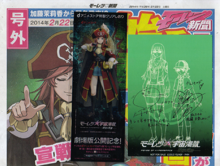 今日ゲットした「モーレツ宇宙海賊」の入場者プレゼント。ポストカードと、クリアしおりと、モーレツ新聞。ポストカードはチアキとグリュンヒルデの組み合わせ。つまり、花澤香菜と金元寿子のサイン入り。出来れば、小松未可子と花澤香菜と戸松遥の何れか二人の組み合わせが良かったんだがなぁ。