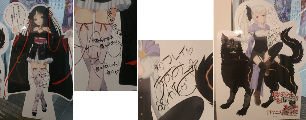 その後、「あの花」オリジナルグッズショップと「機巧少女は傷つかない」アニメ化記念特別展に行く。物販コーナーでは、星奈の痛Tシャツがあったので買おうかと思ったが、結局着ないので止めにした。痛Tシャツって、どうしても着る勇気がなくて、タンスの肥しになるだけだもんな。↓は「機巧少女は傷つかない」のポップ。原田ひとみと阿澄佳奈のサイン入りだったので、パシャっと。