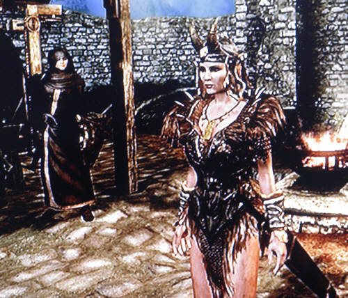 同胞団のクエストを手掛けることにした。まずは同胞団のリーダーと話し、同胞団に加入を頼む。その後、ヴィルカスと手合わせをして、とりあえず、同胞団に加入することになる。その後、剣を持っていたり、盾を持っていったりと言うお使いクエスト。もう、ここでは完全な下っ端。…って、もう別の所ではドラゴンボーンやアークメイジと言われて、尊敬されているんですけどねぇ(笑)。その後、ベットを与えられるが、もう何カ所も家があるので、今更必要ないんですが(笑)。ところで同胞団のアエラ姉さん、なんすかぁ、この色っぽさは。特に横乳が堪らん(爆)(↓:写真じゃ分かりづらいかな。)。いや、彼女の為にここにいてもイイすよぉ(笑)。おおっと、マイキャラは女性だった(笑)。さてその後、ベットルームに案内された男から、ファルメル討伐のクエストを受けることになる。