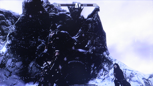 そんなこんなで、ドラゴンズ・リーチでドラゴン生け捕り作戦が開始される。ところがドラゴンが来たときに、その事をすっかり忘れていて、普通に攻撃してしまった(笑)。当然のようにドラゴンのHPが減らない。こいつ、不死身キャラか…っと思ったときに、生け捕ることを思い出して、慌ててドラゴンレンドを使ったが、時すでに遅し。兵士たちが全滅していた。こうなるとアウト。メインクエストが進行しなくなる。実はこの後、このドラゴンを開放するのだが、そのとき装置を作動させるものがいなくなるのだ。このシーンだけは被害を出さないように、短期決戦で行くべし。私は結構こまめに(複数)セーブしているので、直前のデータからやり直したので、大事には至らなかった。さてドラゴンを捕まえた後は、このドラゴンと話し合いをし、解放を条件にアルドゥインがいる場所まで連れて行ってもらう。但し、行けるのは一人だけ。ここで、従者のイリアとはしばらくお別れ。