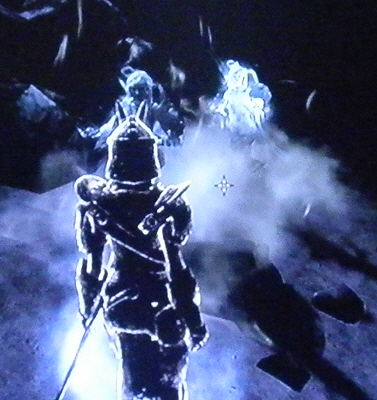 ところで、ウィスプマザーを撮影した。↓の写真で手前のマイキャラの向こうに見えるのがそれ。昨日の戦闘前のデータをロードして撮ったんだが、上手く撮れてないや(苦笑)。それにしても、もう、分裂始めてるなぁ。右の白い靄が、分裂したウィスプマザー。