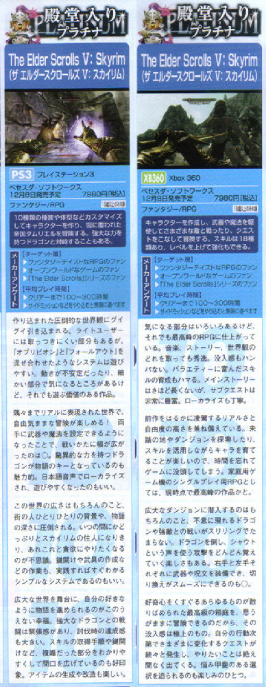 その「スカイリム」だが、今週発売のファミ通のクロスレビューで「10/10/10/10」の満点を取ったそうだ。洋ゲーで満点って、たぶん初めてじゃないかな。これは、益々期待が高まる。