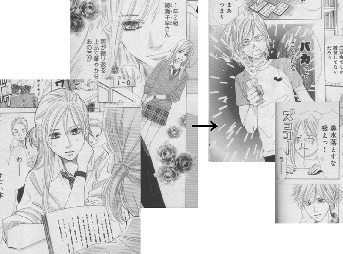 コミック「ちはやふる」を5巻まで借りて、1日で一気読み。アニメも面白いが、コミックもなかなかのもの。特に5巻の千早と化け物染みた現クィーンとの一騎討ちは、むちゃくちゃ盛り上がる。こりゃ、早く残りの巻も借りなければ。あと、千早の無駄美人ぶりも最高(↓)。それにしても、右と左が同一人物とは思えん(笑)。