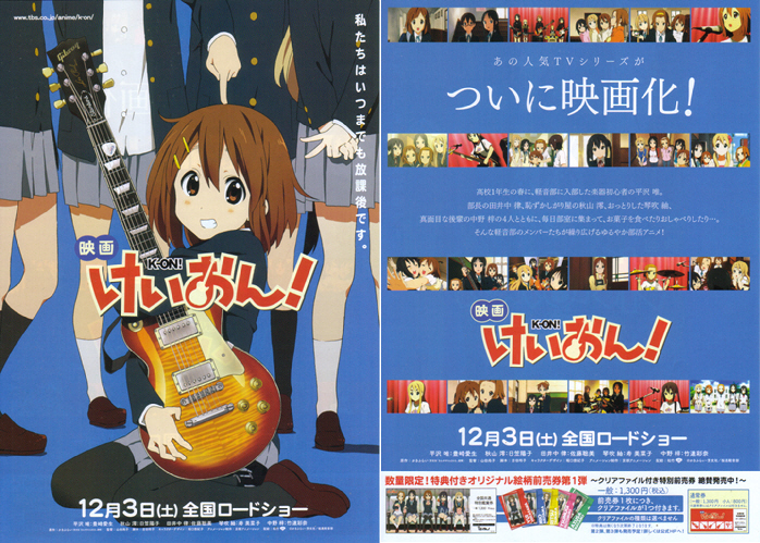 聞くところによると、劇場版「けいおん!」の前売券が一部の劇場では発売日に完売したらしい。マジすか。こんなこと、日本映画界が始まって以来だと思う。なんか凄いと言うより、○○○○って気がするけど(笑)。そんな劇場版「けいおん!」だが、すでにチラシの配布が行われていた。需要があるかな…っと思ったので、チラシの表と裏の画像を載せておきます。