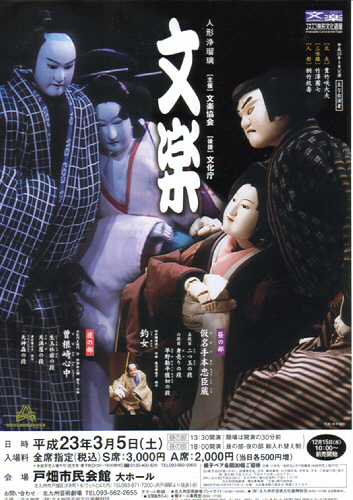 「文楽(人形浄瑠璃)」に行ってきた。人形浄瑠璃なんて、むか~し、一度観たきりなので楽しみだった。今回の演目は「曽根崎心中」。内容が内容だけに年寄りが多いのかと思ったら、若い人も結構多かったし、中には外人さんもいた。結構、色々な人が観に来ていたので、驚いたよ。…にしても、こう言うものって、生で観ると迫力があるよね。観始めると、結構真剣に観てしまう。上演時間は18:00~19:50(途中、15分の休憩を含む)と短めだったけど、十分に楽しめた。また期待があったら、観に行きたいなぁ。しかし、「アニうた」を観に行ったと思ったら、今度は「人形浄瑠璃」って、その守備範囲の広さ…って言うか、節操のなさに我ながら呆れたよ(笑)。