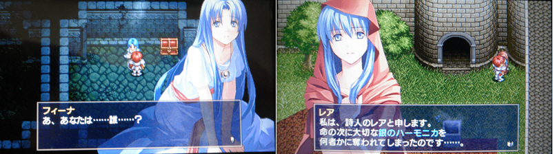 ところで機種は違うとは言え、過去に2回もプレイしているので、解答はすでに知っている。…なら、スムーズにいくだろうと思ったが、これが意外と行かない。結構忘れていて、「あれ?、どうするんだったけ?」と悩むことしばしば。…って言うより、少し謎解きが変わっているような気がする(断定はできないが)。それ以外でも、序盤の草原のステージって、あんなにでかかったけ?…っとか、レアとあんな最初の方で出会っていたっけ?…っとか。結局、忘れているんだろうなぁ。まぁ、それならそれで、新鮮な気持ちでプレイできるってもんだ(笑)。ただ、フィーナ救出後、ダンジョンの中をフィーナがよちよち付いて来る演出は以前は間違いなくなかった。もう、この辺りのフィーナは可愛すぎて、惚れ直したよ(笑)。しかも、OPのフィーナ(&レア)がババア臭かったのでガッカリしたが、本編ではそんな事もなく、一安心した。しかし、今回はCVなしなんだね。残念。