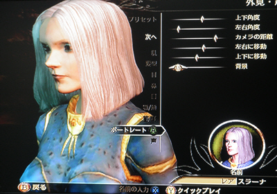 とりあえず、マイキャラは貴族の女性で戦士。髪は金髪のミディアム(本当は、ロングかセミロングにしたかったんだが、パーツがなかった)で、声は神秘的な感じ。顔のアップの写真が上手く撮れなかったので分かりづらいと思うけど、↓のような感じ。もう少しいじりたかったんが、項目があまりの細かすぎて段々分らなくなってきた(その割にないパーツもあるし)。さてスストーリーだが、まず最初に大ネズミ退治のクエストがあり、その後、敵兵の闇うち、逃亡、沼地のクエスト、闇の軍勢との戦闘…っと言った怒涛の展開。ただ行動範囲も決められているし、完全な一本道ストーリー。まったく自由さがないので、些かガッカリだった。内容も冒険ものっと言うよりは、「指輪物語」的な壮大な戦記ものなので、ちょっと私好みから外れるかな。但し、仲間に魔女のモリガン(こいつの衣装エロすぎ)が入ってから、ワールドマップが表示されるようになったので、ここからの行動が自由なんだろうな。つまり、ようやく本筋に入った…って事か(ここまでの道のりが長すぎ(笑))。ところで、マイキャラが闇の軍勢との戦いのとき、オーガに止めをさすシーンがむちゃくちゃカッコ良かった。しかも、時々モンスターの首を斬るシーンなんかもあって、清楚な外見の割に結構エグイ戦闘をする(笑)。…ってところで、今日は終了。