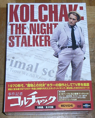 遂に買ってしまった、「事件記者コルチャック」のDVD-BOX。実はこの作品の存在を知ったのは、友達からで。本放送の時はさすがに知るすべもなかったが、再放送のとき、友達が面白いと教えてくれた。ただ深夜放送だったので(当時、ビデオなんてなかった)、その時視聴出来たのは「心臓を抉るアステカのミイラ」だけ。その後、ず~~っと気になっていたが、やっと全話観れたのは、10年ほど前に「スーパーチャンネル(現スーパー!ドラマTV)」で放送した時。確かにSFXはちゃちだが、ストーリーや内容が面白く、むちゃくちゃ気に入ってしまった。…で、今回のDVD-BOXだが、やはり不満がある。2本のパイロット版が収録されていなし、予告編もないし、英語音声もない。だが、データを増やすことで、DVDの枚数が増えて、価格がアップしては元も子もない。ただでさえ、BOXは高いんだから。まぁ全話、ノーカット仕様だし(TV放送はかなりカットしている)、これはこれで良いんじゃないかな。そんな訳でさっそく観たいんだが、今日は時間がないなぁ(こんな文を書いているからだよ(笑))。明日から観るか。