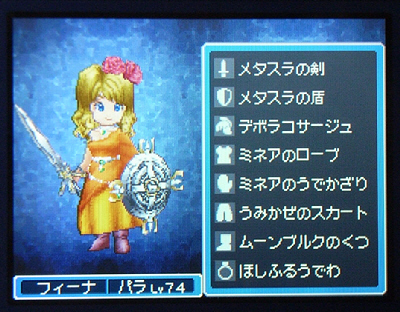 久しぶりに「ドラクエⅨ」をプレイした。…って言うよりはスペシャルゲストに会って、プレゼントを貰っただけなんだけどね(笑)(誕生日に貰えるのだ)。貰った物から選んで、キャラに着せてみる。頭に「デボラのコサージュ」、服に「ミネアのローブ」、腕に「ミネアの腕飾り」、足に「ムーンブルクの靴」。で、こんな感じ。