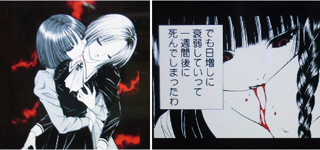 最近、ケータイコミックにハマり気味。確かに一見安そうだが、データの配信料の少なさを考えると、町のレンタルコミックに行った方がはるかにお得。ただ手軽だし、何よりも普段読まないような作品を知ることができる…っというメリットもある。そんな中で、吸血鬼好きの私が偶然見つけたのが「緋色の花(あるうぇ)」(写真左)と「吸血鬼を待つ館(榎本由美)」(写真右)の2作品。「緋色の花」は心優しき吸血鬼が登場する百合色が強い作品。絵があまり上手い作者ではないが、悪くない作品だ。一方、「吸血鬼を待つ館」は吸血鬼と言うよりは悪魔的な物語。一人の人間を生涯苦しめる、その所業はかなり悪質。それなりに良くできている話だが、キャラデがあまり好みでないのが難。さて、また面白い吸血鬼ものがないが探してみるかな。