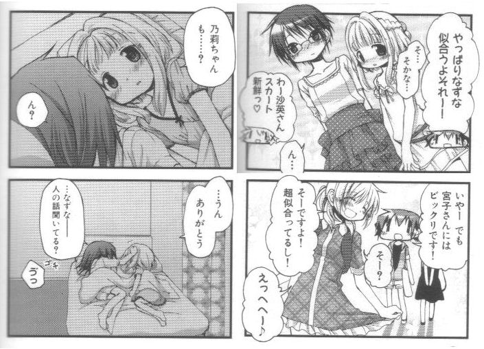 今巻の見どころは何と言っても、添い寝するなずなと乃莉だね☆(写真左)。後、いつもと違う雰囲気の服を着たなずな(&沙英&宮子)(写真右)もなかなかのもの。