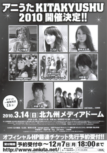 来年3月に開催の「アニうた KITAKYUSHU 2010」のチラシがあったので、もらってきた。出演者がすべて決まっている訳でないので、正式なチラシではないだろうが(白黒だし(笑))、とりあえず載せておく。