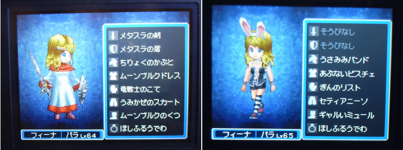 「ドラクエⅨ」の今週分の配信クエストをダウンロード。帰宅後、さっそくクエストをクリアしようとしたが、今週のクエストは「れんごく天馬」絡みかよ。「れんごく天馬」はまだ遭遇してないんですがぁ。探すのも面倒くさいので、とりあえず、未クリアの宝の地図に挑むことにした。すると、宝箱の中から「あぶないビスチェ」を発見。おおっ、これで、あのクエストをクリアできるぞ。今日は、もうこれでOKっと言うことにしようっと(笑)。さて手元からなくなる前に装備して、記念撮影。う~ん、下着があれ以上外せないので、イマイチ色っぽくないなぁ。ついでに、今週のゲストのムーンブルクの王女からもらったドレスを装備し、記念撮影。こちらは、むちゃくちゃ可愛いぞ☆