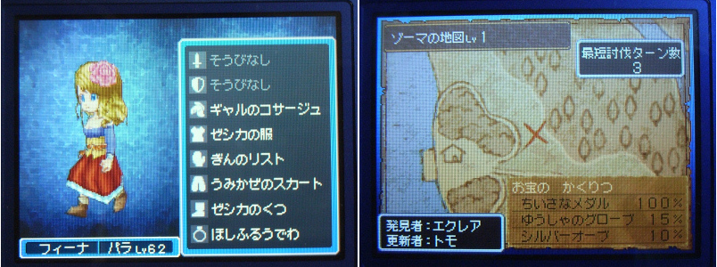 「ドラクエⅨ」の配信クエストをダウンロードしに行く。今週のゲストはゼシカ。ゼシカから貰った服をさっそく装備。これにコサージュをつけると…。か、可愛すぎ☆。あまりに可愛いので、記念撮影をしてしまった(笑)。あと、今日のすれ違い通信で、なんと「ゾーマの地図」をゲット。おおっ、スゲー。ただ、現在のレベルでは歯が立たないだろうな(笑)。挑戦するのは、もう少しレベルを上げてからっと。ところでダウンロードしたクエストのクリアは、月曜日くらいかな。明日はちょっと用事があるので。