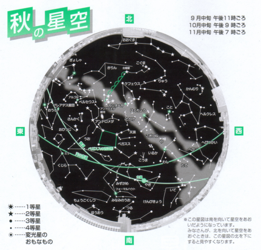 プラネタリウムで秋番組が始まっていたので、観に行ってきた。今回の番組は、地球の誕生から今までの歩み、そして秋の星座の紹介だ。「地球の誕生~」は初心者にも分かりやすく説明しているので良いが、「秋の星座」は単に星座の紹介だけで終っているのが残念だ。せっかくペルセウス座、アンドロメダ座、くじら座などが出てくるんだから、神話の説明までして欲しかった。