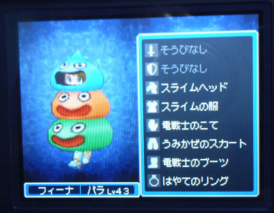 「ドラクエⅨ」も相変わらずプレイしている。今日なんか、1~2時間で止めようと思ったのに、半日以上プレイしてしまった(汗)。クエストも宝の地図も着々とクリア中。ただクエストクリアの為とは言え、↓の格好はさすがにイヤだったな(笑)。あと、すれ違いでもらった「竜王の地図」をトライしたけど、瞬殺された(笑)。これに挑むのはまだ早いと言うことか。…にしても、強すぎ。