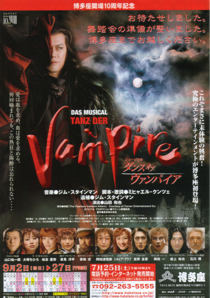 「ダンス・オブ・ヴァンパイア(博多座)」を観に行ってきた。以前から舞台ミュージカルは観たいと思ってたが、なかなか機会がなくて、実は舞台ミュージカルを観るのは今日が初めて。ミュージカル映画は相当数観ているんだけどね(笑)。しかもヴァンパイアものなので、ミュージカル大好き&ヴァンパイア大好きな私が観ないわけにはいかない。料金がかなり高かったので悩んだが、思い切って観ることにした。…で感想だが、凄い、凄すぎる!。しかもむちゃくちゃ面白いし、楽しい。思い切って観て良かったよ。大満足だ。生のダンスに、生の歌に、そして生の演奏がこれほど大迫力だとは(実は最初テープだと思っていた。途中で指揮者の存在に気がついた(笑))。今までミュージカル映画で満足していたなんて…。この面白さを知ったらもう戻れない…って感じだ。最初は「ミュージカルと言っても、日本語だし」なんて思っていたが、実際に始まるとまったく気にならない。しかも回転する舞台に、宙吊りに、豪華な衣装、もうこれらを観るだけでも、観劇料を払う価値がある。あと、一応A席ではあったが結構後ろのほうだったので、「楽しめるかな?」っと思っていたが、思った以上にステージに近く、十分に堪能できた。しかも通路側だったので、すぐ横を役者が通るので、シーンによっては最前列以上の近さで役者を観ることも出来た。一度なんか(墓場のシーン)、女ヴァンパイアに襲われたし(笑)。