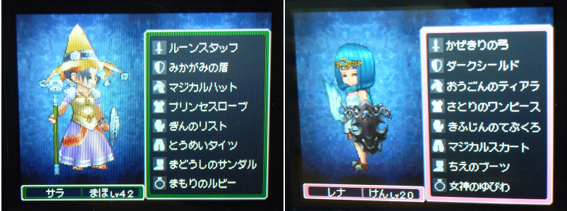 サラ(魔法使い)→彼女は色々と変わっている。盾が「ダークシード」、頭が「マジカルハット」。防具は「水の羽衣」にしようか、「アリーナの服」にしようかな、結構悩んだ。単純に守備力を考えれば、「アリーナの服」が上だが、魔法効力を考えて最終的に「水の羽衣」にした。