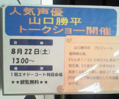 今日から北九州美術館分室で、「高橋留美子展~It's a Rumic World~」を開催(私も近いうちに観に行く予定)。それに伴い、今日、リバーウォークで山口勝平さんのトークショーが開催されたようだ。私は時間がなかったので参加しなかったが、時間があれば観てみたかったなぁ。