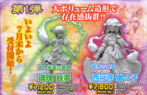 ↑のフィギュアが入っていた箱に今後のリリース情報がは封入されていたが、その中で気になったのが↓の11月発売の幽々子。なんと、ゴスロリ姿の幽霊ですかぁ。これまた、私好みな。これは買わないといけないなぁ。どこかで予約しないと(笑)。
