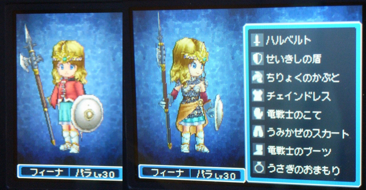 「ドラクエⅨ」をプレイ。ただ、どうにもガナン城に突入する気になれなくて、いまだ本編とは関係ないクエストをクリアさせている。…で今日挑戦したのが「パラディン勝負」。さっそく、クエストをクリアしようとしたが、我がフィーナちゃんはパラディンとして成長しすぎて、うまくいかない(何故かは、クエストをクリアした人なら分かるよね)。そんな訳で別の娘をパラディンに転職させて(スキルポイント稼ぎにもなるし)、再挑戦。それでも相当に苦労した。なんか、ボス戦より疲れたぞ。その甲斐あって、チェインドレス(写真右)を手に入れた。これがなかなか可愛くて、すぐに装備させたよ(ククールの服(写真左)を装備させていた時間が短かった(苦笑))。それにしても、そろそろガナン城に突入しないとなぁ。